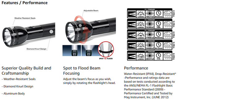 Bright lights, burly cases, fail-safe on/off switches, virtual indestructibility: there are good reasons to rave about Mag rotating the head. The light is housed in a case made of high-strength aluminum alloy that has been anodized inside and out. This, along with high-quality O-rings at both openings, give you water- and shock-resistance in a lightweight package. Maglite's switches are rubber-coated, weather-protected, and self-cleaning-they're virtually indestructible. In short, this flashlight is almost indestructible-a good quality when it comes to the tools re rely on to help you find your way in the dark. Limited lifetime warranty. Requires 3 D-cell batteries (not included). Includes spare bulb (stored in end-cap). If you want the same design in a smaller package or if you want more run-time than 3 D-cells will give you, see Mag Instrument products #S2D016 and #S4D016.--Josh Dettweiler
