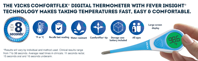 Get temperature results quickly and easily, when you need them most. The Vicks ComfortFlex Digital Thermometer provides accurate readings within +/- 0.2 degrees F in only 8 seconds. Designed for comfort and convenience, this thermometer has a flexible tip. The unique Fever InSight guide helps you get temperature readings at a glance with a color coded display, and understand them easily. A green display suggests a normal temperature, yellow signifies an elevated temperature and a red display indicates a high temperature. Because it can be used as an adult thermometer for oral readings as well as be used a rectal thermometer for babies or even used under the arm for toddlers and kids, it’s perfect for the whole family. It also has a memory feature that recalls and displays last temperature taken and is waterproof for easy, thorough cleaning. Plus, this temp thermometer includes a storage case, battery and has a limited 1 year warranty.
