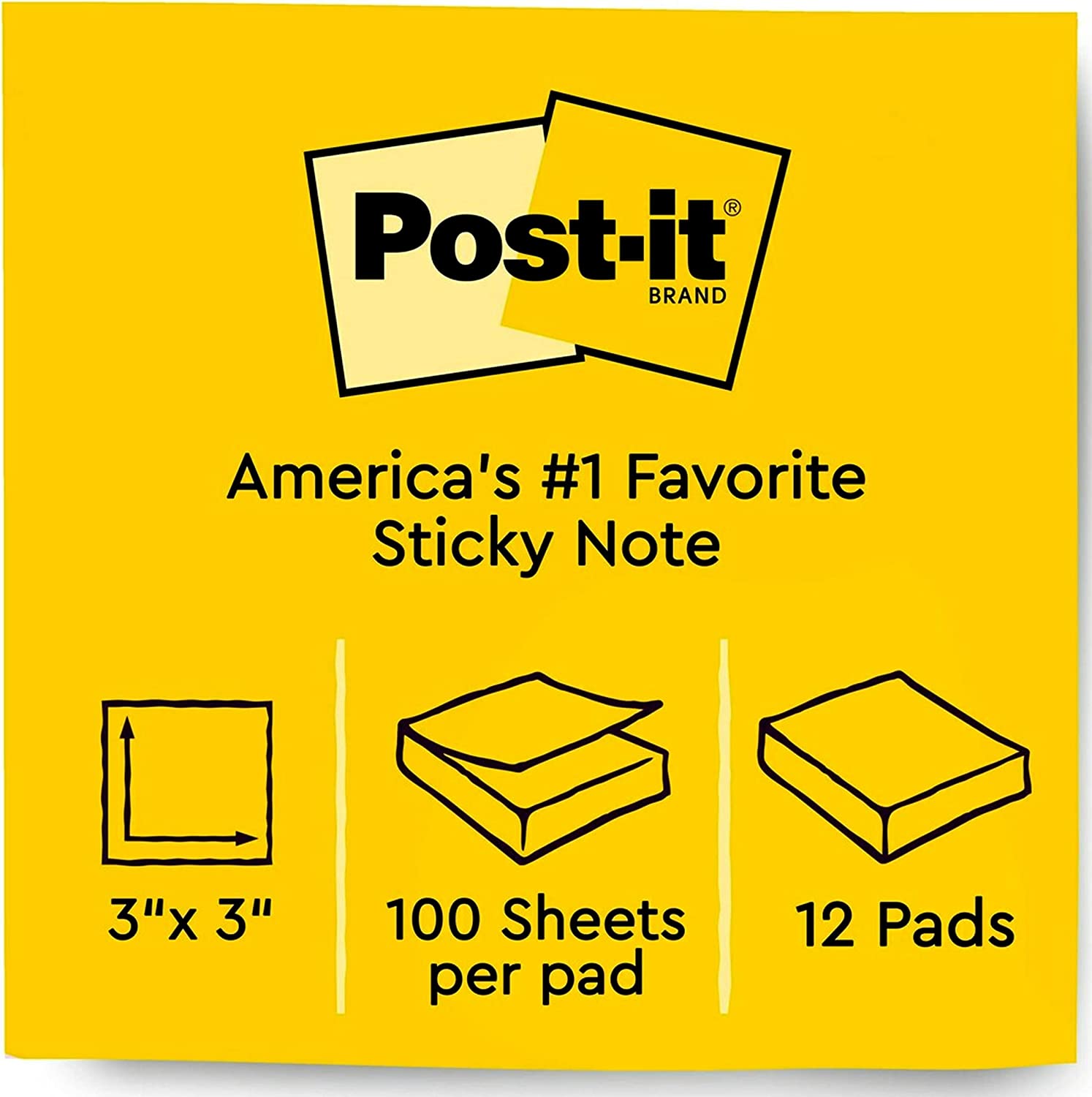Post-it Notes 3x3 in, 12 Pads, America's #1 Favorite Sticky Notes, Canary Yellow, Clean Removal, Recyclable (654)