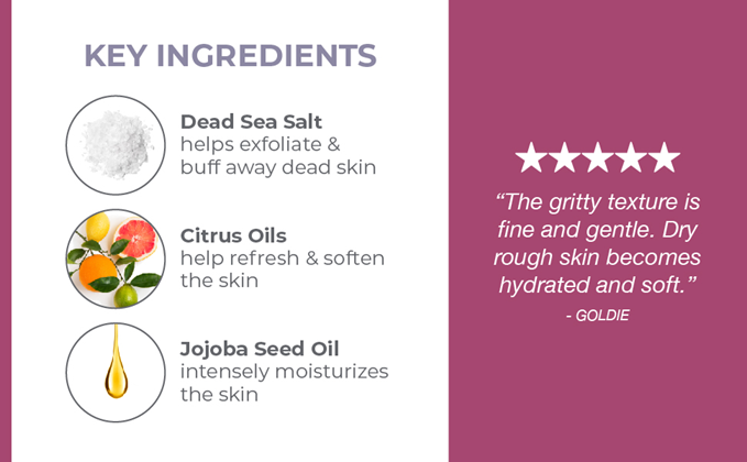 • SMOOTHS & DETOXIFIES: The Dead Sea Salt exfoliating facial scrub smooths the appearance of wrinkles and buffs away dead skin, leaving skin feeling renewed. A refreshing Citrus Oil blend softens skin, for a re-energized, glowing complexion.