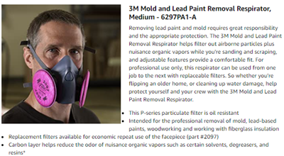 Removing lead paint and mold requires great responsibility and the appropriate protection. The 3M 6297 Mold and Lead Paint Removal Respirator helps filter out airborne particles plus nuisance organic vapors* while you're sanding and scraping, and adjustable features help provide a comfortable fit. For professional use only, this respirator can be used from one job to the next with replaceable filters. Whether you're flipping an older home, or cleaning up water damage, help protect yourself and your crew with the 3M 6297 Mold and Lead Paint Removal Respirator.