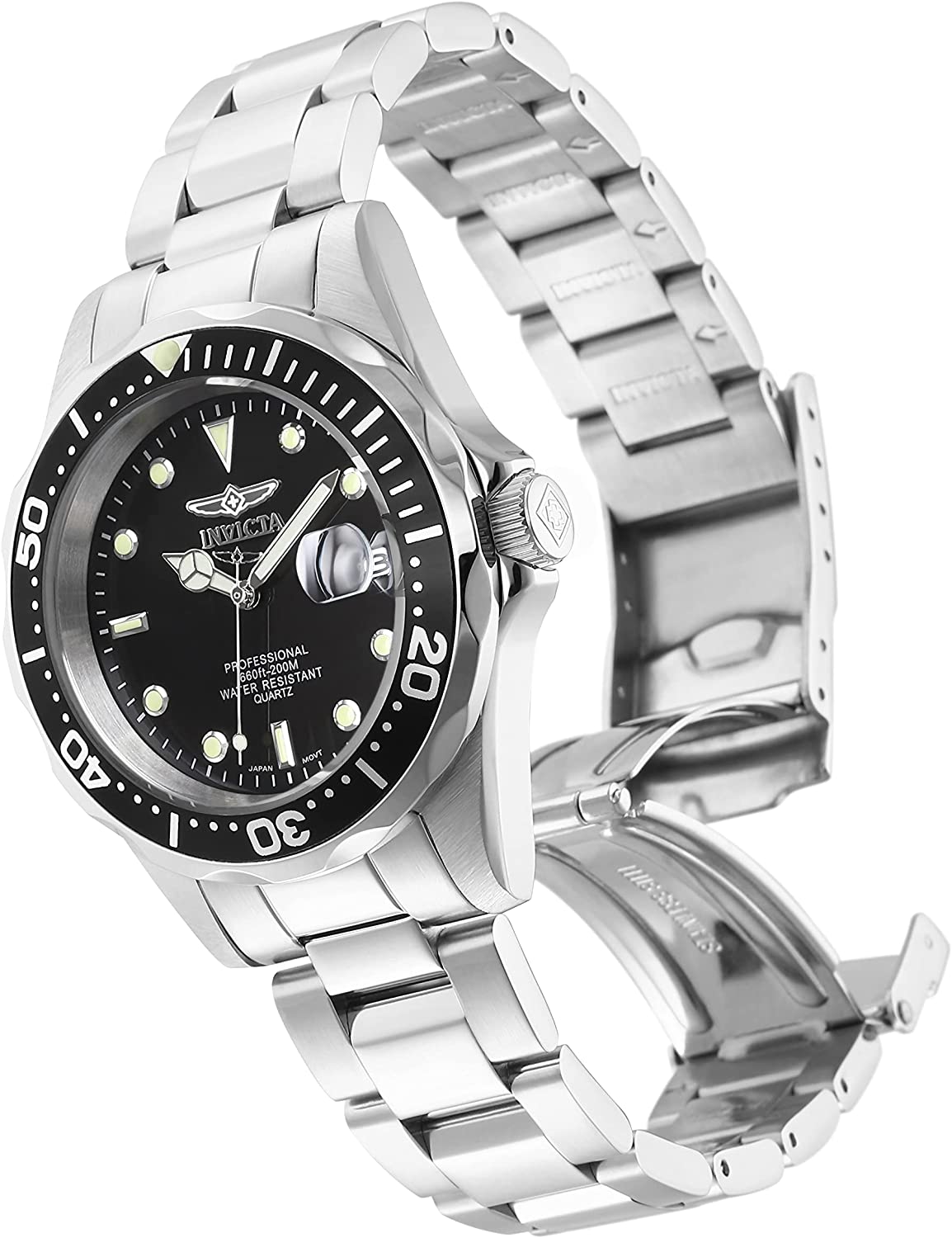Explore the depths with the Invicta Pro Diver. With a 300-meter water resistance, this watch can withstand the amount of pressure necessary for a deep diving adventure. The chronograph keeps track of your progress, so you can easily time yourself on your underwater adventure and resurface in plenty of time for the rest of your day. An easy-to-read date window is on the dial so you never miss an appointment. This stunning stainless-steel watch with a blue dial is the perfect complement to any outfit, so you can transition between activities seamlessly. Never settle for just a watch. Get a work of art with Invicta.