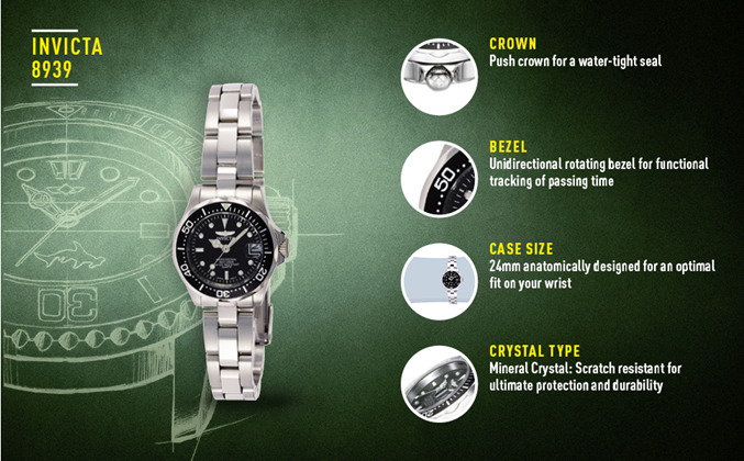 • Mineral crystal; Push/pull crown; Unidirectional stainless steel bezel with black top bezel ring; 100 meter water resistant: Suitable for recreational surfing, swimming, snorkeling, sailing and water sports. Not suitable for diving.
