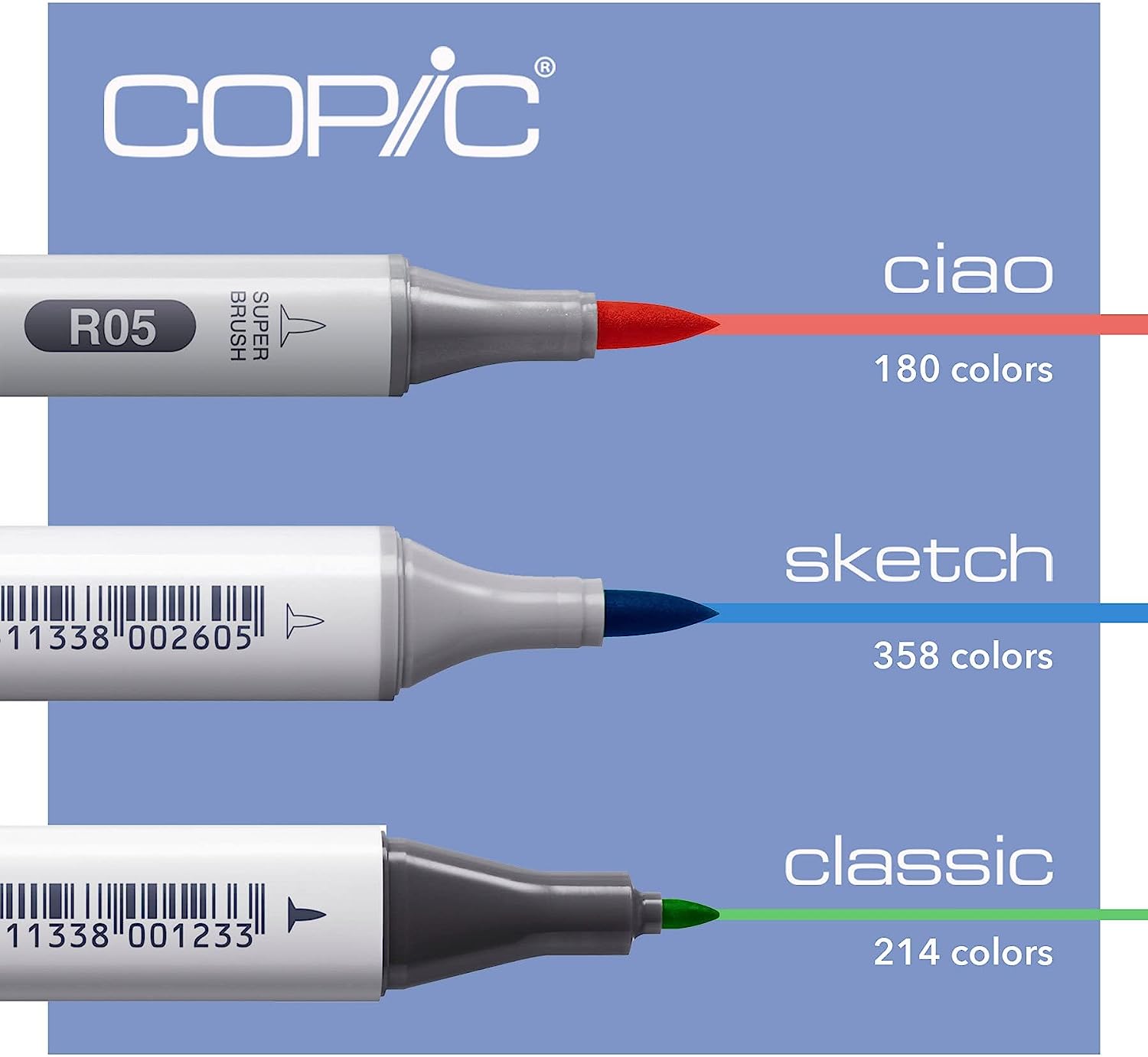 These Copic markers are versatile double-ended refillable markers with fast-drying, permanent non-toxic ink, ideal for calligraphy, airbrushing and graphic arts applications. These markers feature a broad tip on one end offering smooth, consistent coverage for large areas, while the fine tip on the other end allows for easy detail work. Comes with various Neutral Grays and Special Black.