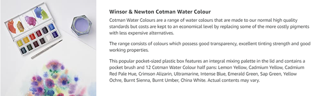 • Cotman Water Colours possess good transparency, excellent tinting strength and good working properties.