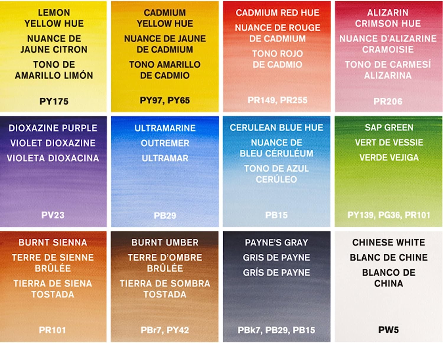 • This water colour set contains 14 Cotman Water Colour half pans: Cadmium Yellow Pale Hue, Cadmium Yellow Hue, Cadmium Red Pale Hue, Alizarin Crimson Hue, Ultramarine, Cobalt Blue Hue, Viridian Hue, Sap Green, Yellow Ochre, Burnt Sienna, Burnt Umber, Chinese White.