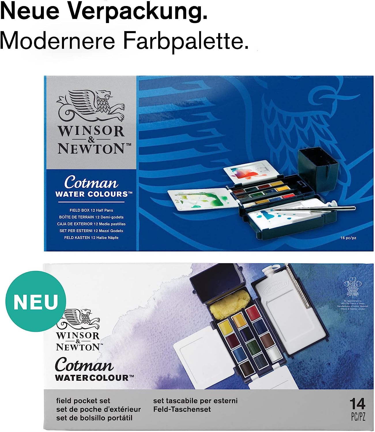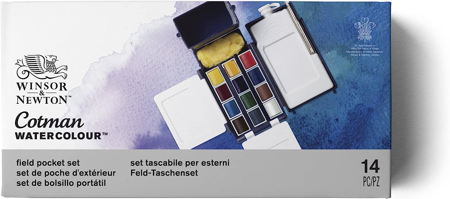 Winsor & Newton 390639 Cotman Water Colour Paint Field Box Set, 14 Piece Set, Half Pans