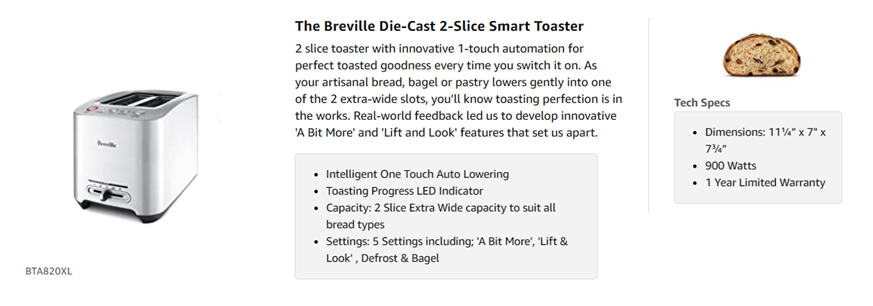 • The Breville 2-Slice Smart Toaster is a compact toaster that lets you feel in control; One touch automation lets you monitor your toast's progress using "Lift & Look" and add extra time using " A Bit More" to toast your favorite bread types to perfection