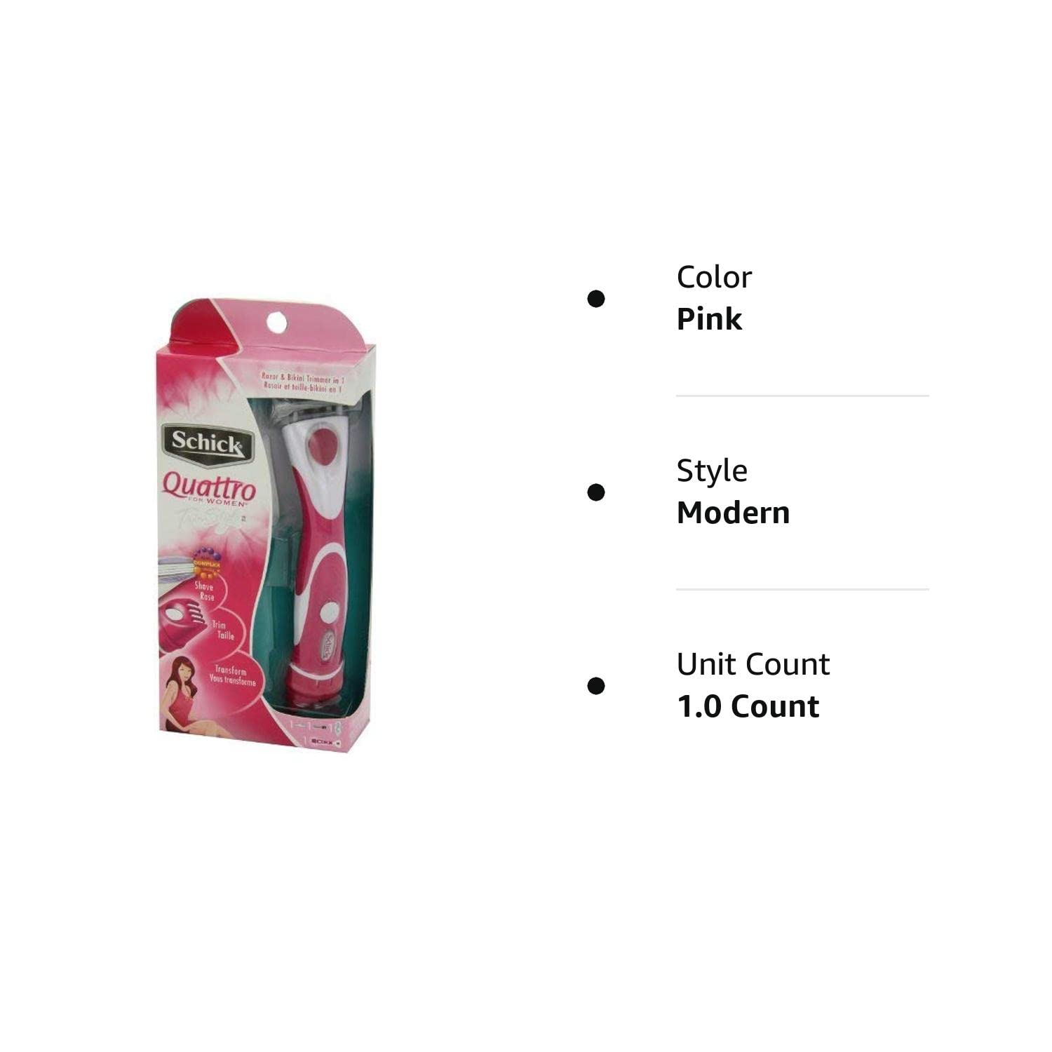 For a smooth shave wherever you need, the Schick Quattro for Women TrimStyle Razor and Bikini Trimmer offers dual function in an easy-to-use, compact tool. A vibrating, pivoting head with four blades provides greater flexibility and allows you to follow the natural curves of your legs and body. The battery-powered trimmer is ideal for your bikini area and offers three length settings for a close, clean shave.