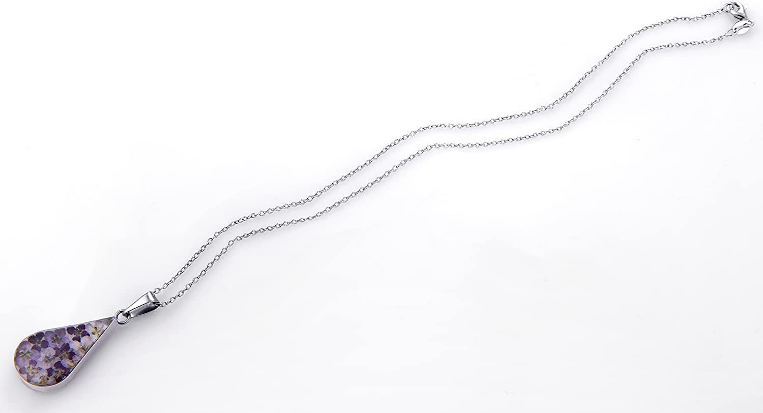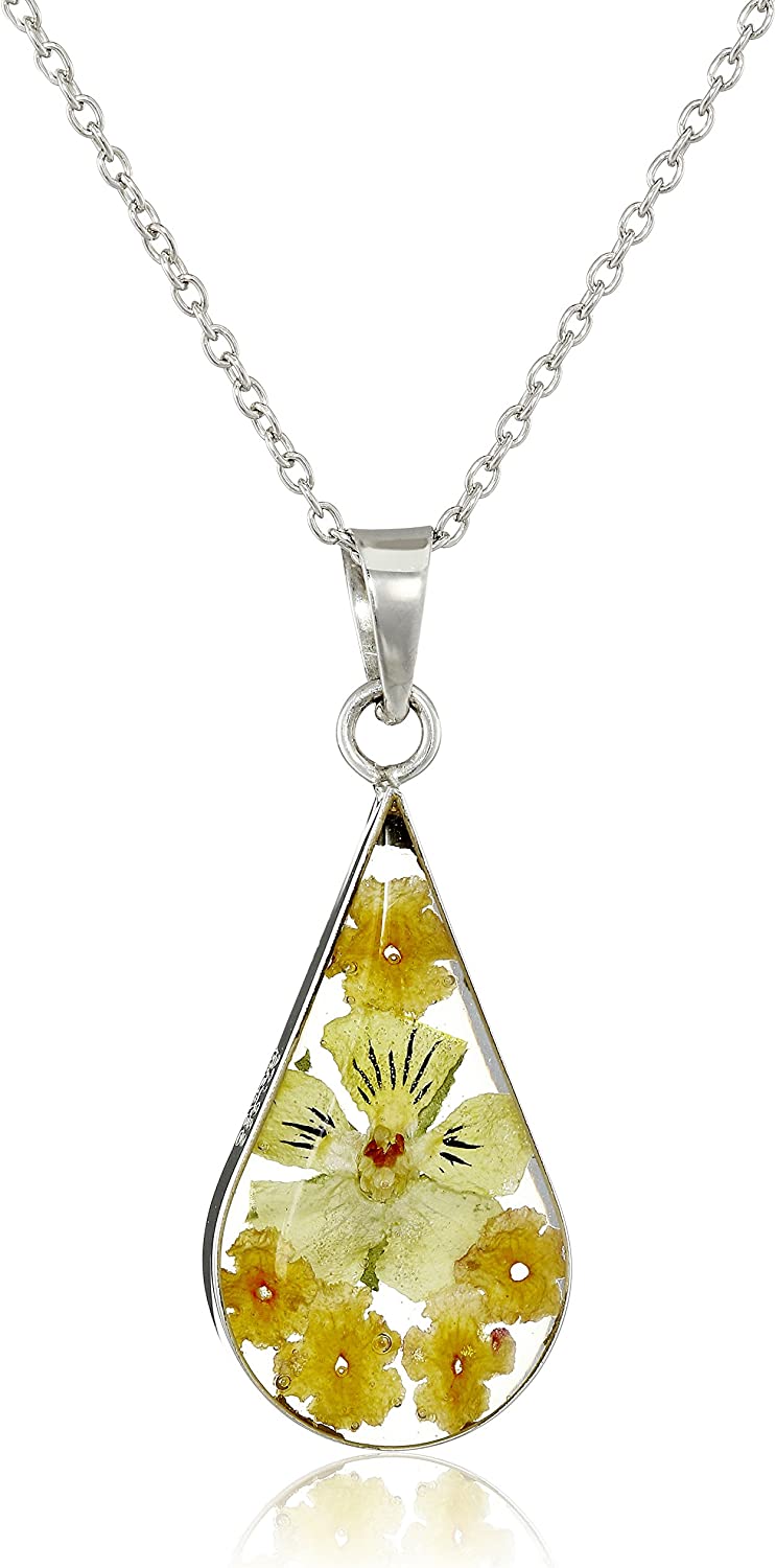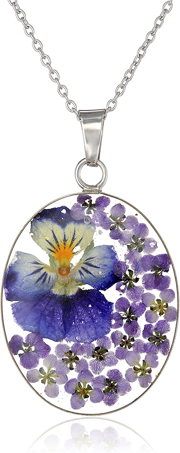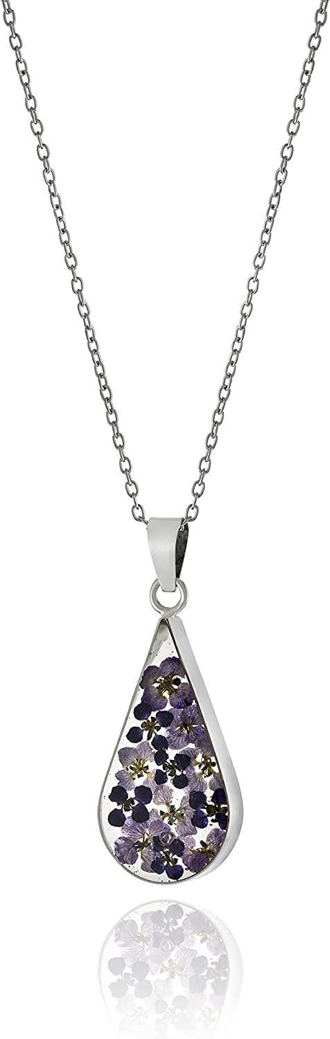 • Charmingly unique, pressed flower jewelry is handcrafted from real flowers and is preserved in a clear resin surrounded by .925 silver.