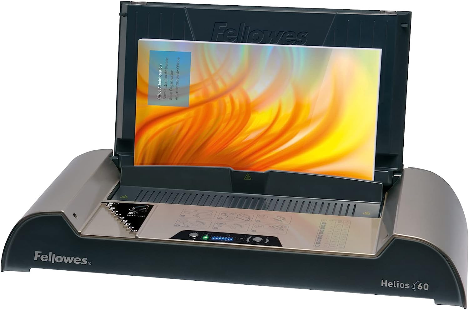 Ideal for frequent use in large offices, the Fellowes Helios 60 Thermal Binding Machine features an auto document thickness detector with auto-binding cycle that selects thermal binding settings for the user. Binds documents up to 600 sheets in a single step. 1-3 minute thermal binding cycle with 4-minute heat-up time. Heat Shield safety barrier prevents accidental contact with the heating plate. Visual indicators signal when machine is ready for thermal binding and heat cycle begins once document is loaded. Ready-beep sounds when thermal binding cycle is complete. Internal clamps hold documents in place during thermal binding process. Auto shut-off safety feature prevents overheating. Stylish design folds flat for storage. For use with thermal binding covers only.