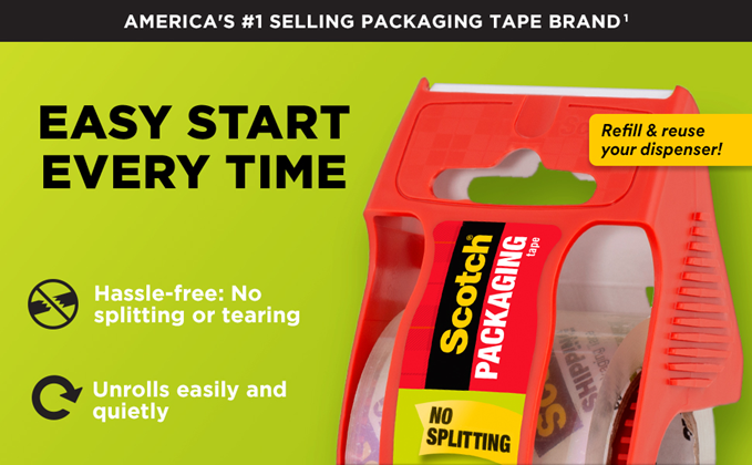 When you’re in the middle of packing boxes, the last thing you want to do is search endlessly for the end of the tape. The search is over with Scotch® Sure Start Packaging Tape. This tough, strong tape comes off the roll easily and smoothly with no slivering or splitting, so you can skip the frustration and get to taping faster. This tape also delivers a whisper quiet unwind, which makes it ideal for use in an office or home setting where quiet is critical. Never lose the tape end again, and when it quietly unwinds off the roll and is applied to your package, it stays on—keeping your package securely sealed. Clear to the core, Scotch® Sure Start Packaging Tape stands up to rough handling—but is so easy to handle. Scotch® Sure Start Shipping Packaging Tape—stress free, always ready to roll to help you get the job done.