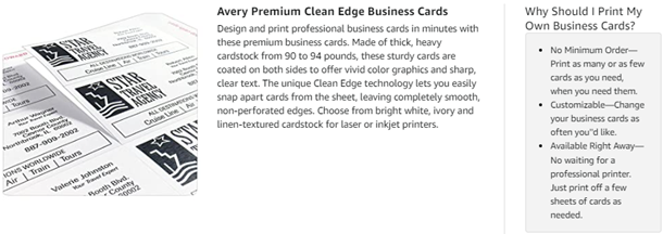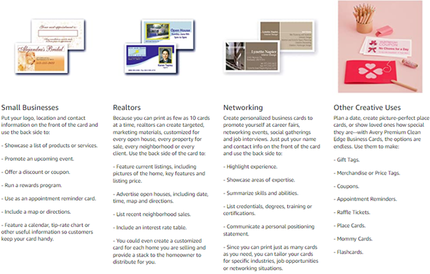 Get professional quality business cards without having to pay the professionally printed price. Avery 8859 Clean Edge Business Cards includes 200 customizable business cards made from premium glossy cardstock (matte on back) with weight of 83lbs / 227gsm, and offers a high-quality blank canvas optimized for printing vibrant colors and sharp, clear text. If you need customizable business cards, customer loyalty cards, appointment reminder cards or more, these 2" x 3.5" cards are an exceptional way to stand out from the crowd. These white business cards have innovative Clean Edge technology for quick and easy separation, giving you the cleanest, smoothest edges of any business card on the market. Also, proprietary Avery Sure Feed technology helps reduce misalignments, minimize paper jams, and avoid wasted projects when printing on your inkjet printer. Whether you have your own design or you're creating one from scratch, take your brand or business to the next level with Avery Design & Print Online, which makes it easy to create and print double-sided customizable cards from your own home or business. The free browser-based software has everything you need to design business thank you cards, appointment cards, rsvp cards for weddings, reward cards and more. Try it out today on the Avery website and print at home or in the office on your inkjet printer.secures your card or insert in place, while the clear plastic badge window allows unobstructed visibility without needing to remove it from the holder. Each badge holder is pre-punched to accommodate the included 36" non-elastic neck cord or other attachment devices like clips, lanyards or reels (other attachments not included). These badge card holders are also compatible with Avery Badge Inserts 5390 and 5392 (inserts sold separately), making them great for custom name tags, name tags for kids and more. The size is also perfect to use as vaccine card holders (vaccine card sizes may vary, so please measure your card first to confirm fit). Item comes with 100 plastic badge holders and 100 neck cords.