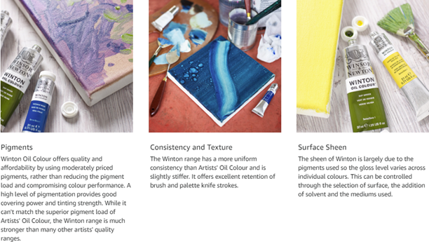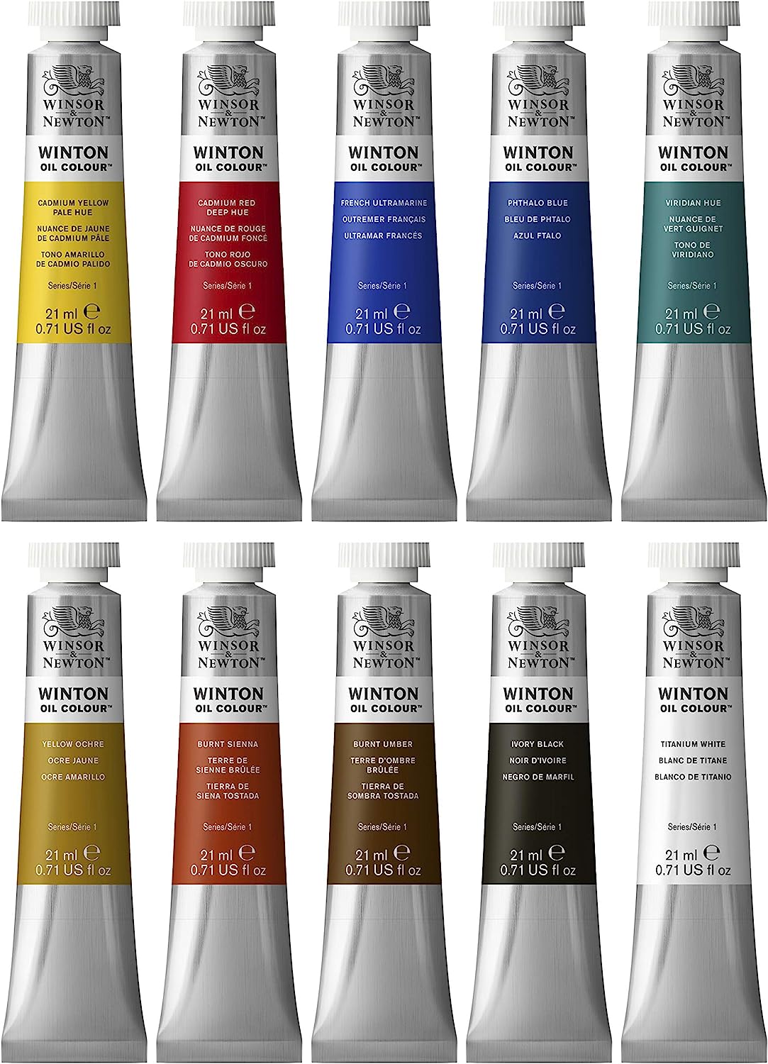 The Winton line is a traditional range of oil colors. They're made from moderately priced pigments and formulated for student and amateur artists or more accomplished artists requiring large volumes of color within moderate cost limits. This package contains ten 21-milliliter tubes of paint (cadmium yellow pale hue, cadmium red deep hue, french ultramarine, phthalo blue, virdian hue, burnt umber, yellow ochre, burnt sienna, ivory black, titanium white). Conforms to astm d4236.