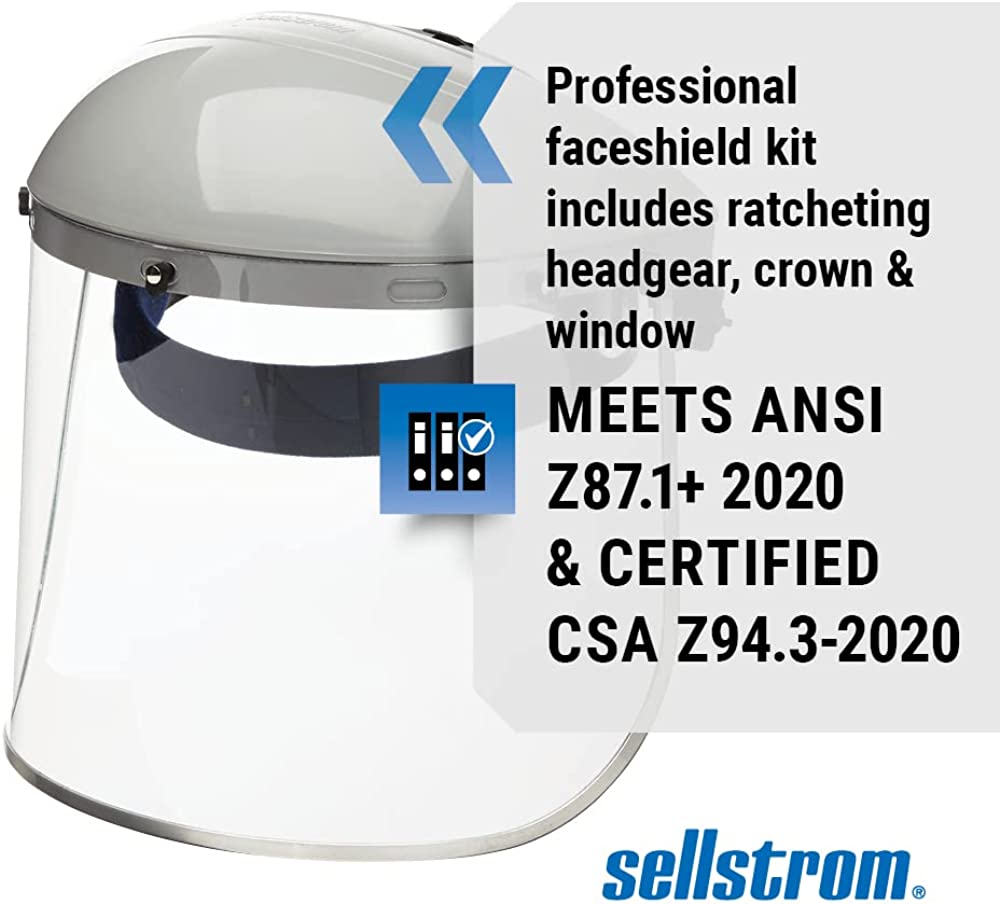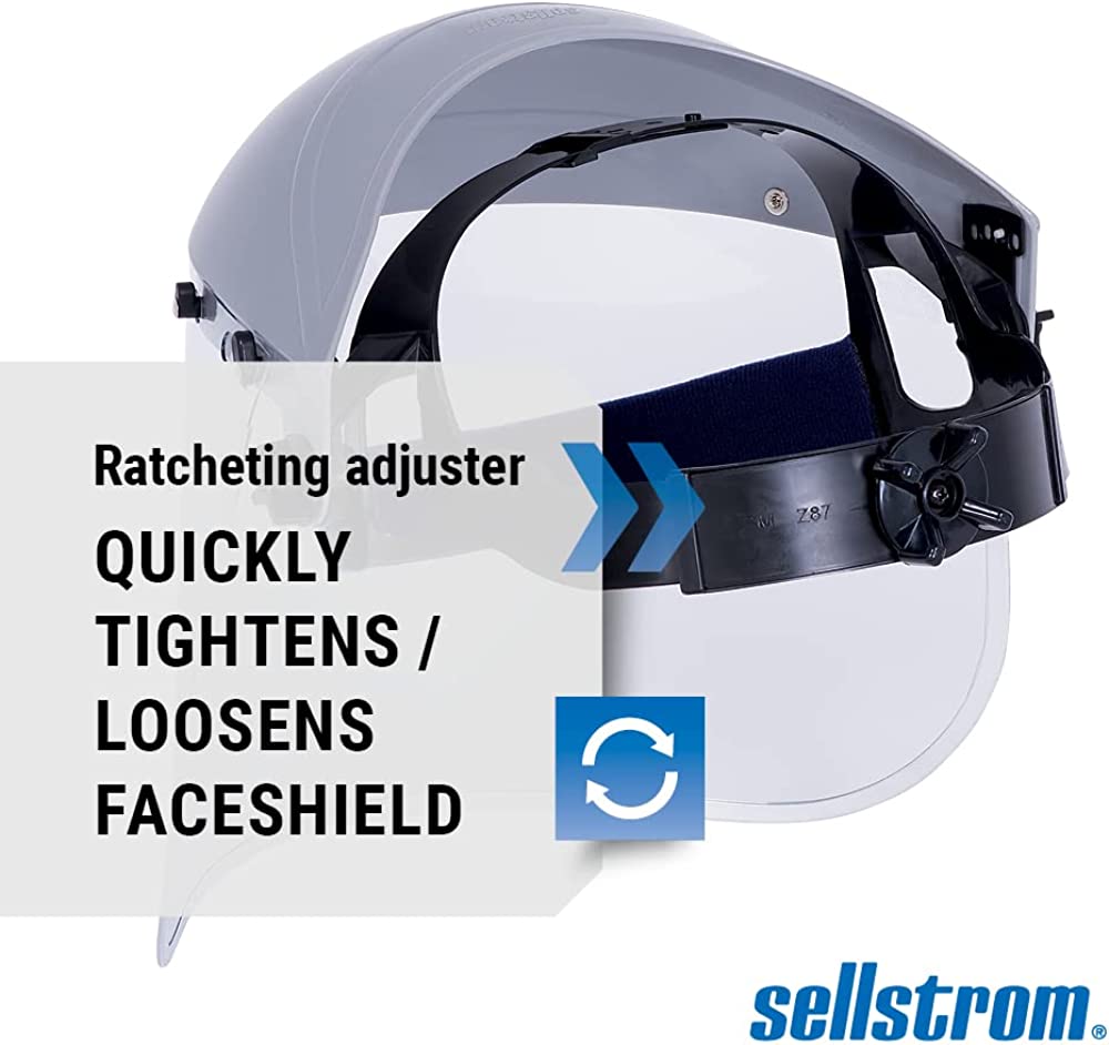 FACE SHIELD FEATURES: Includes a grey abs crown, uncoated clear polycarbonate window with aluminum binding and ratchet headgear and pin closure. Abs injection molded crowns have universal bracket pin pattern for use with any window mount