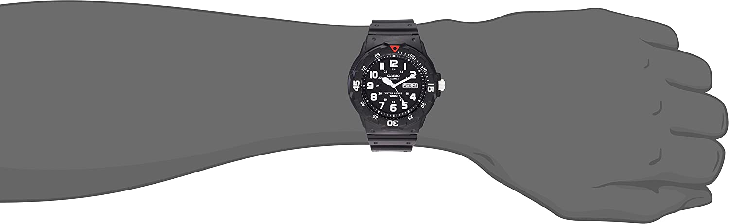 If you're searching for great value in a classic diver-look watch, look no further than the MRW200 from Casio. Its 44.6mm face and large indexes provide at-a-glance information.Couple this with a bi-directional rotating bezel and 100 meter water resistance and you've got a timepiece that's easy-to-read, simple-to-use and durable. Black resin band analog watch with a black face