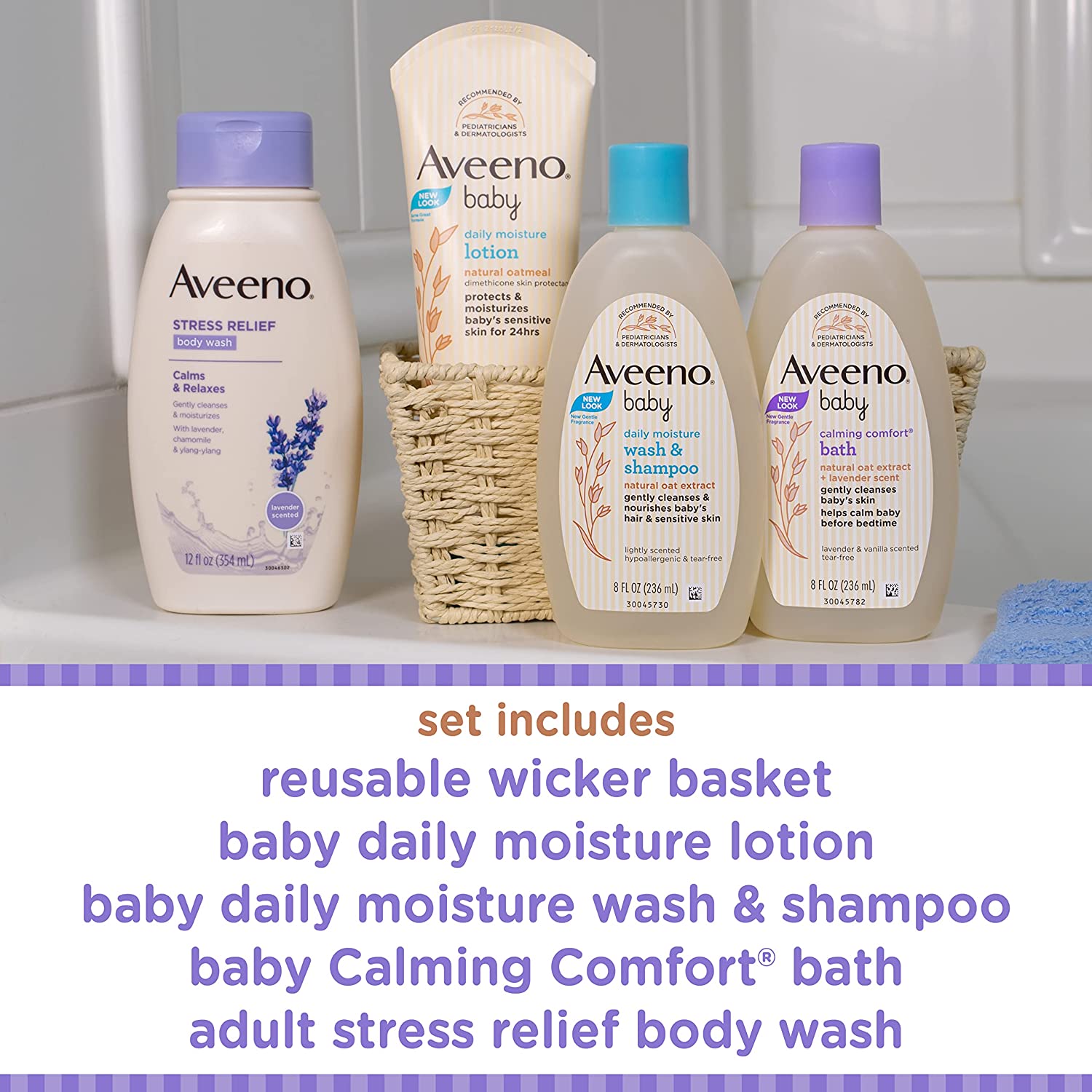 4-piece Aveeno Baby Mommy & Me Daily Bathtime Solutions Gift Set is a collection of baby bath essentials in a convenient, reusable wicker basket that includes everything you need for bath time with your little one, plus a bonus for mom