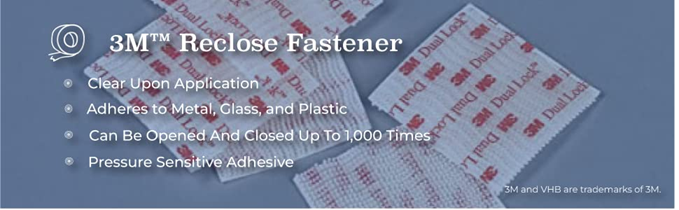 - 3M DUAL LOCK RECLOSABLE FASTENERS: These clear, interlocking mushroom-shaped fasteners provide strong, reliable and durable fastening that can be opened and closed multiple times. An alternative to screws and bolts, hidden fastener provides a snug fit and smooth aesthetic appearance.