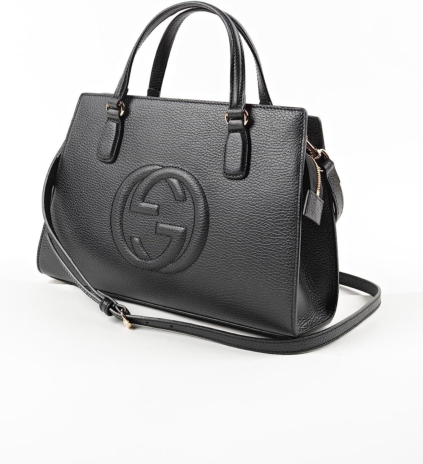 • This beautiful Gucci Soho Tote with embossed interlocking GG logo is a stunning addition to any handbag collection. Crafted in beautiful black calfskin leather this beautiful piece can be carried by hand or by the detachable leather shoulder strap.