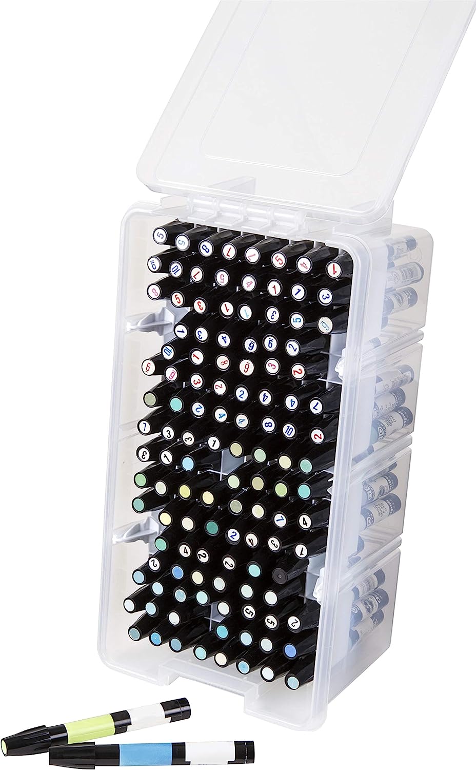 - Convenient Design: The ArtBin Marker Storage Satchel has a marker organizer tray with 64 small compartments for markers, paintbrushes, and more. The organized compartments of the tray allow you to quickly and easily see all of your supplies at once. No more digging through boxes of markers, pencils, and pens to find what you need!