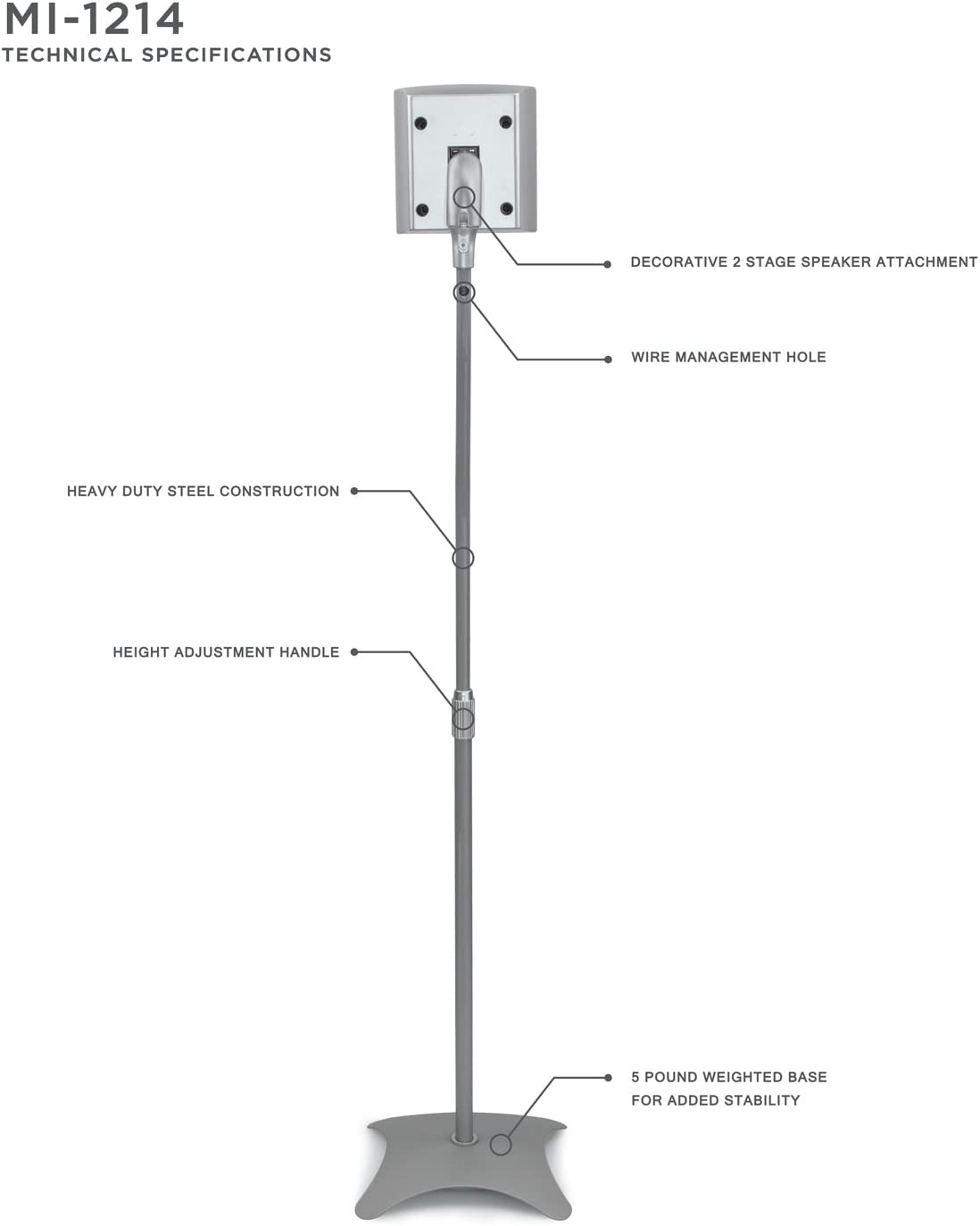 ADJUSTABLE HEIGHT SPEAKER STAND - The pole height is adjustable from 26.8-Inch (680mm) to 43.3-Inch (1100mm), to place your speakers at optimal height for stereo or surround sound. Heavy-gauge offset steel pillar features integrated wire channel for cable management system through middle of stands.