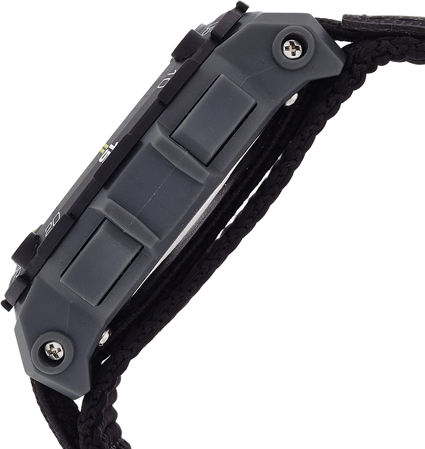 The Black Nylon Strap Grey Round Digital Chronograph Watch includes all the features needed for a casual sport watch and has a high tech look that. The round, grey resin case and black bezel feature polished silver-tone screws and white printing. The digital dial displays the time in Arabic numerals along with day of week, date and seconds across the top. Other functions of this watch include chronograph functions, alarm, lap timer, dual time, and military time. The comfortable, black, nylon strap is designed with stitched patches and a rubber Armitron graphic. Strap securely fastens with a nylon and loop closure. This timepiece offers reliable quartz movement and is water-resistant to a depth of 330 feet (100 meters).