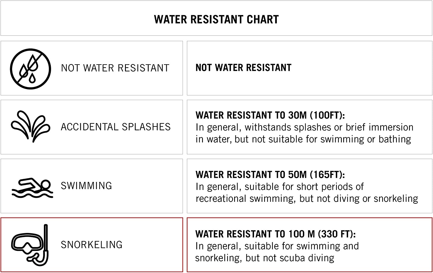 • Water resistant to 330 feet (100 M): suitable for snorkeling, as well as swimming, but not diving