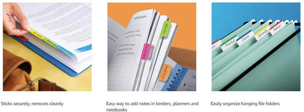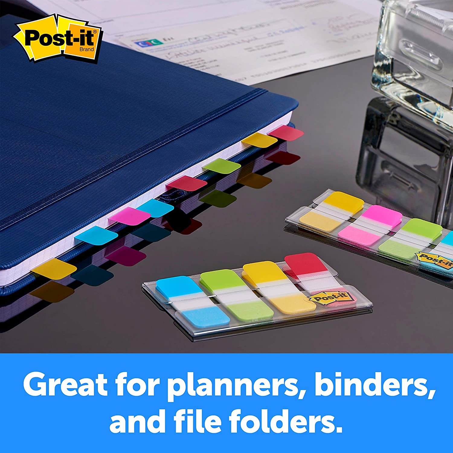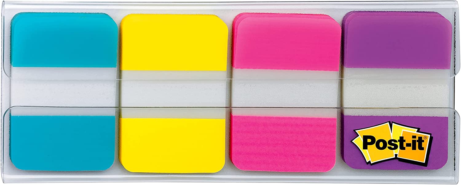 Post it Tabs in 1 inch size create necessary order by easily organizing planners and calendars into sections. Solid color bars give you flexibility to organize by color. Tabs are durable, you can write on them, and reposition as needed. They are also great for planners, binders and file folders. Tabs stick securely and remove cleanly. Aqua, Yellow, Pink and Violet. Contains 22 tabs/color and 88 tabs/on the go dispenser.