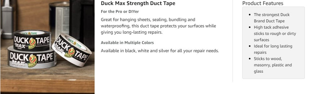 Designed to maximize duct tape's three interlocking layers, Duck Max Strength Duct Tape has received best-in-class ratings for its strong adhesion and holding power to everything from wood, masonry, plastic and glass. Whether you're a pro on the construction site or a DIYer in need of something stronger, Max Strength grade tape is both easy-to-tear and tough enough for all your repair needs. Also great for hanging plastic sheeting, sealing, bundling and waterproofing, this heavy-duty duct tape protects your surfaces while giving you long-lasting repairs. This tape is 1.88 inches by 35 yards in length. Made in the USA.