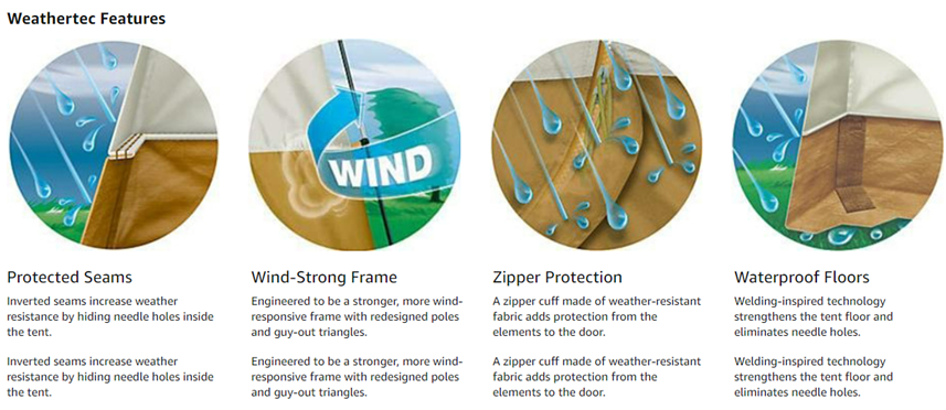• WeatherTec system and full rainfly keep interior dry and comfortable
