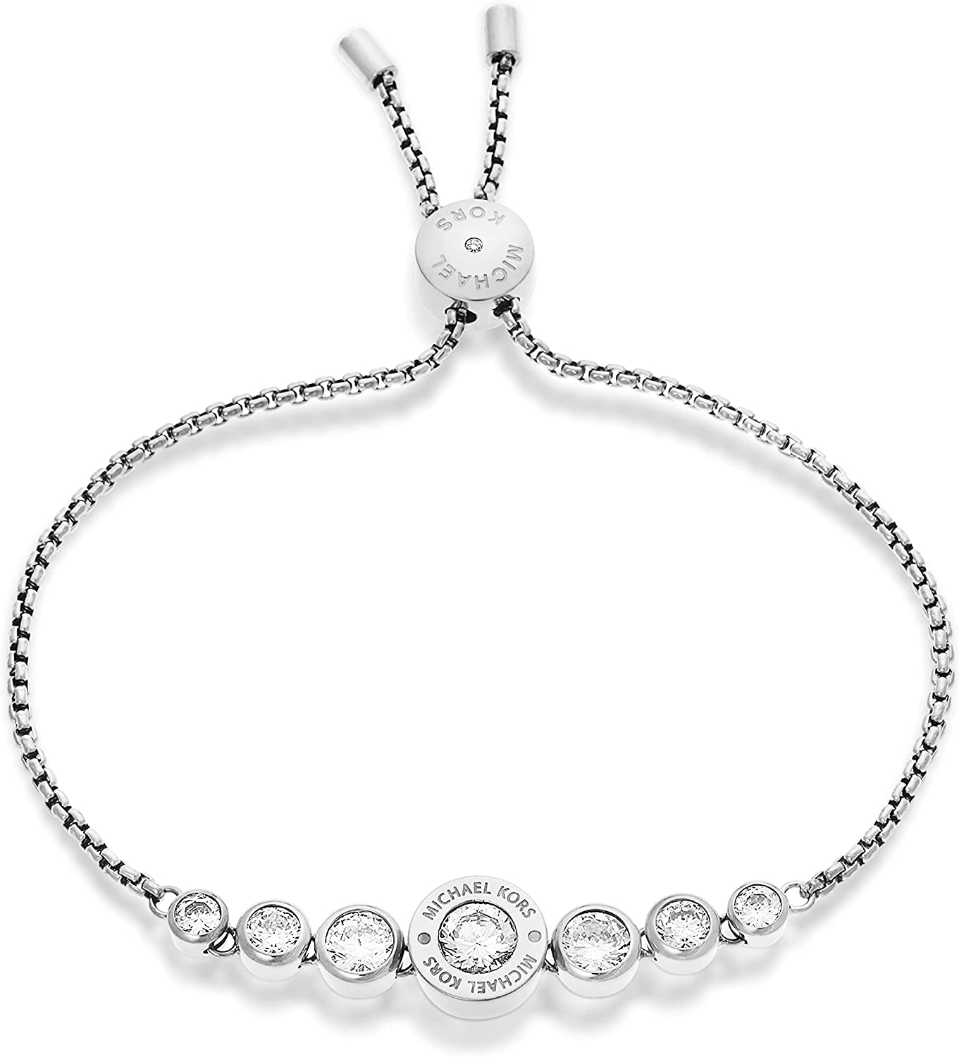 Be charmingly chic in this silver-tone Michael Kors Jewelry beaded bracelet; Four pavé crystal beads add sparkle, and the slider clasp is finished with the MK logo