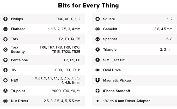 | Head Style | Phillips, Flathead, Torx, Torx Security, Pentalobe, JIS, Hex, Tri-point, Nut Driver, Square, Gamebit, Spanner, Triangle, SIM Eject, Oval, Magnetic Pickup, Standoff, |