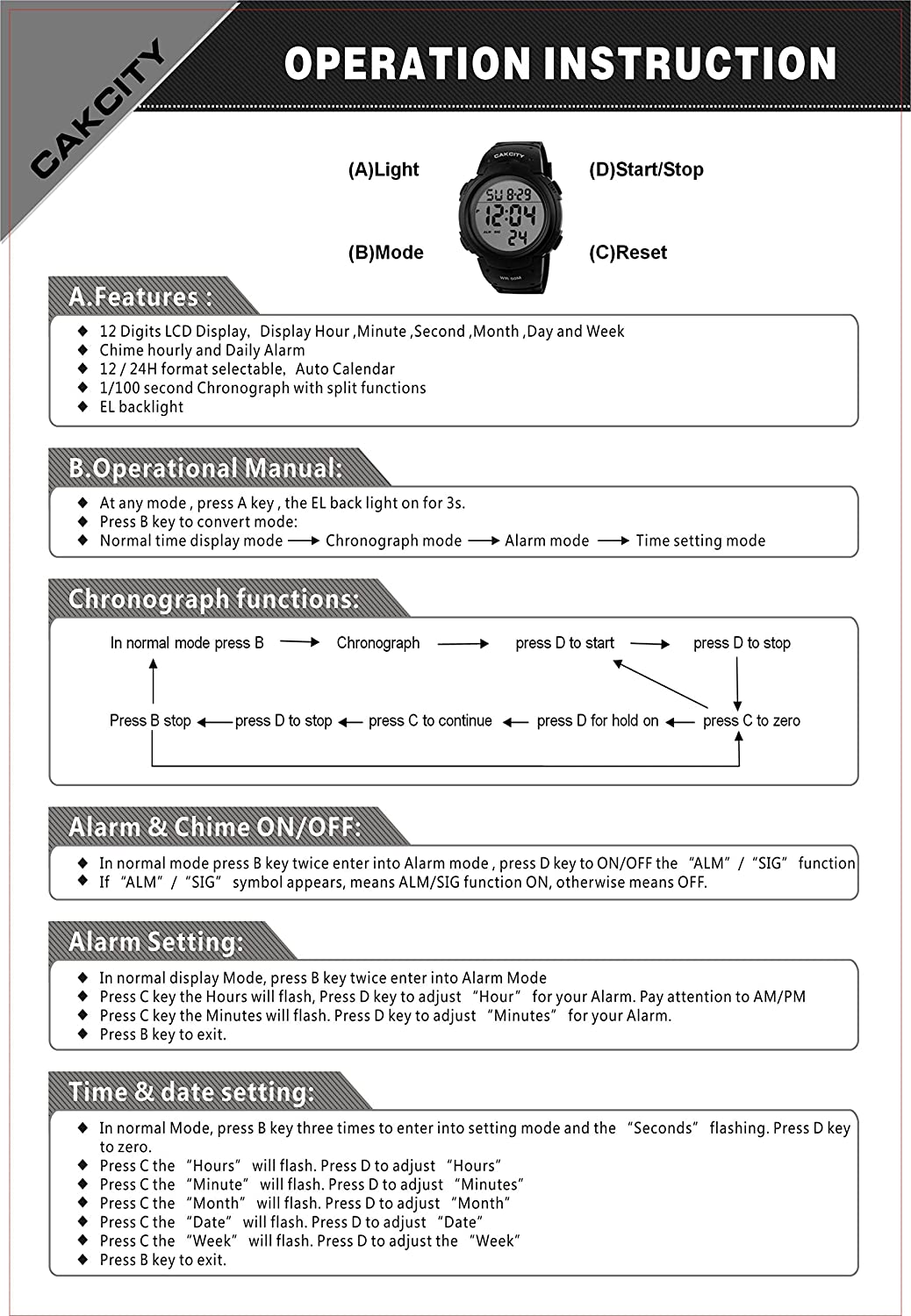 • Waterproof: 164 Ft / 50 M water resist, Please DONOT press any buttons underwater, and in case of damaging waterproof ring,please keep it away from steam and hot water.