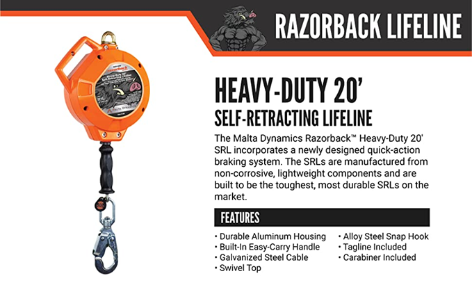• SAFETY & VERSATILITY: Our Malta Dynamics Razorback Heavy-Duty Self-Retracting Lifeline is designed to meet or exceed ANSI and OSHA SRL standards, providing outstanding performance and dependability. This SRL can support an ANSI rated worker weight capacity of 130-310lbs and is suitable for overhead use only