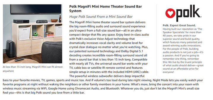 - Polk's exclusive Voice Adjust Technology even lets you INDEPENDENTLY CONTROL VOICE LEVELS maximizing sound clarity and minimizing voice delays and muzzled sounds. Equipped with INDEPENDENT MODES FOR MOVIES, MUSIC, AND SPORTS, it delivers balanced sound clarity so that you hear every word, making your movie, sports and music experience absolutely exquisite