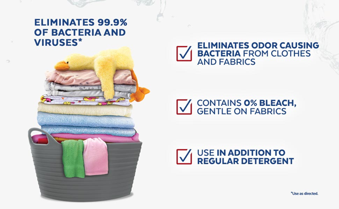 Our clothes are in constant contact with bacteria throughout our day-to-day activities, for example through contact with contaminated surfaces, other people and our own bodies. Bacteria can spread from one fabric to another in the laundry basket, from the washing-machine drum to the next load. Some these bacteria can survive a wash cycle and can cause potential infection risk with pathogenic bacteria. When it comes to certain laundry loads such as children's clothes or sportswear, you want your detergent to eliminate bacteria that can cause illnesses and create lingering bad smells. But detergents alone don't actually kill all bacteria. Introducing Lysol Laundry Sanitizer, an additive specially designed to kill 99.9% of bacteria left behind. Simply add Lysol Laundry Sanitizer to your rinse cycle. It does not contain any bleach and even works in cold water so is safe to use on most fabrics including whites, colors and darks.