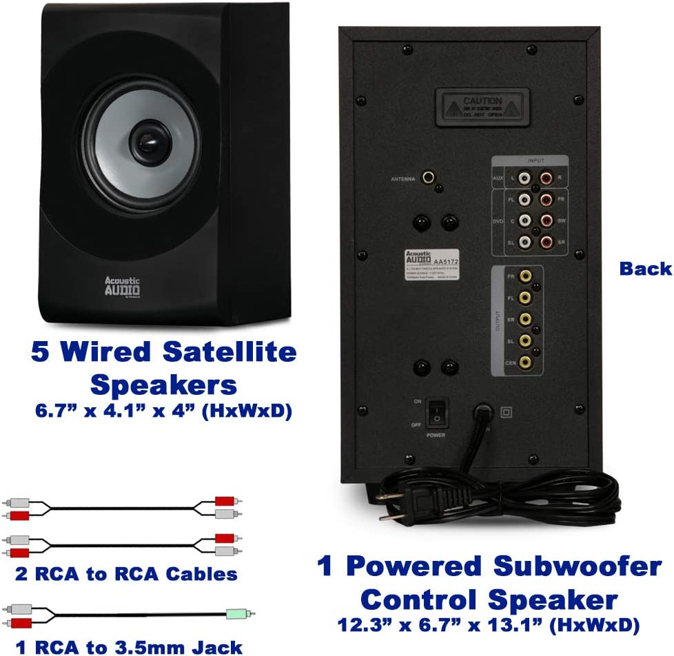 Acoustic Audio AA5172 700W Bluetooth Home Theater 5.1 Speaker System with FM Tuner, USB, SD Card, Remote Control, Powered Sub (6 Speakers, 5.1 Channels, Black with Gray)