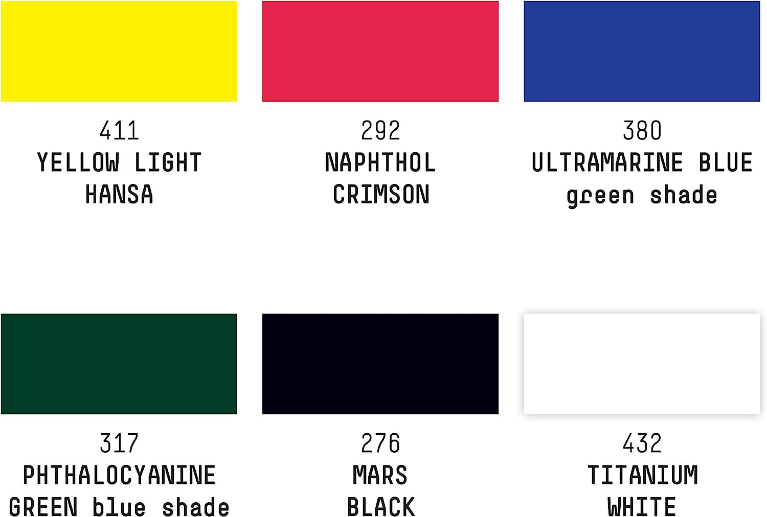 Basic palette for the student, beginner, or professional. Set includes six 2 oz tubes of heavy body artist acrylic colors consisting of cadmium yellow medium hue, Naphthol crimson, ultramarine blue (green shade), Phthalocyanine green (blue shade), Mars black and Titanium white.