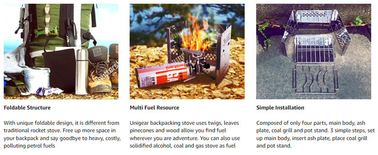 • Portable and Ultra Compact: Unigear camping stove made with stainless steel, which can be folded like a book, and come with a carrying bag for your easy carry. Perfect for camping, hiking, backpacking.