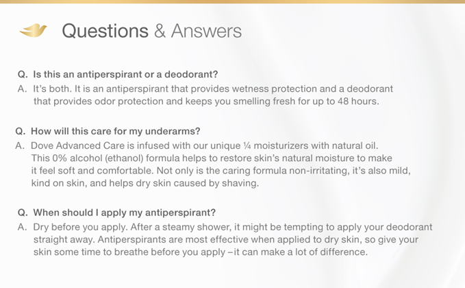 • Effective protection and kind to skin; Dove advanced care lavender fresh antiperspirant deodorant stick keeps your underarms dry and odor-free for up to 48 hours while being kind to your skin