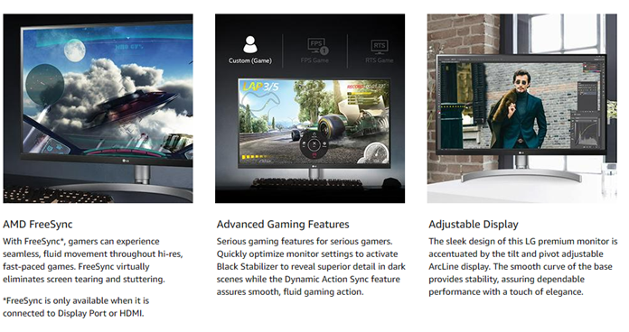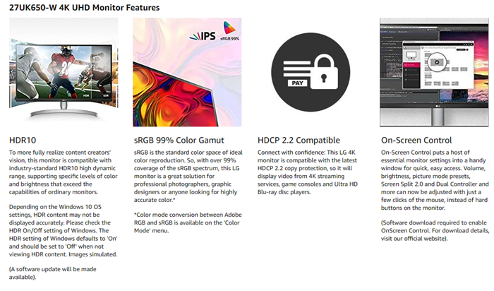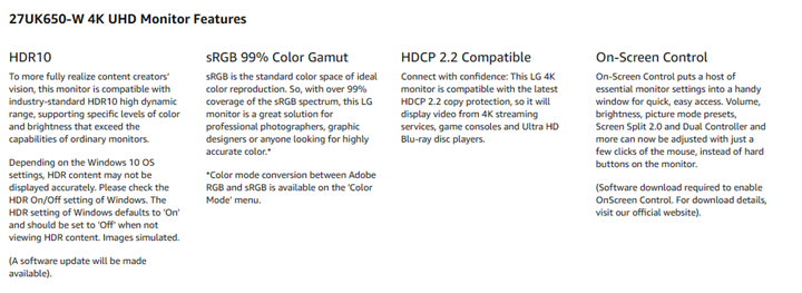 LG 27UK650-W 27” Inch UHD (3840 x 2160) IPS Display with HDR 10, sRGB 99% Color Gamut, AMD FreeSync Technology, 3-Side Virtually Borderless Design