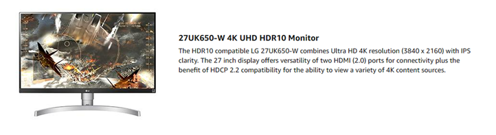 Lg's 27UK650 W combines Ultra HD 4K resolution (3840 x 2160) with IPS clarity. The 27 inch display offers versatility of two HDMI (2.0) ports for connectivity plus the Benefit of HDCP 2.2 compatibility for the ability to view a variety of 4K content sources. The brightness is 350 nits. Power Save/Sleep Mode (Max.) 0.5 watt . Normal On (factory out condition Typ.) 45 watt .