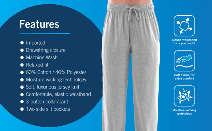 You unwrap the package; you just know it's another pair of pajamas, so maybe your heart drops a little. As you rip off the wrapping, you are pleased to discover that familiar Fruit with a bright red apple staring back at you: Fruit of the Loom. Despite initial reservations, you grin; you know good quality when you see it. And then you pull out the jersey knit sleep set which you are pleased to discover is a soft-hand feel. This means it melts a little under your fingers. It's really that soft. You know you'll be sporting this little number out on the backyard grill, in the confines of your bedroom, in your man Cave. The three button henley collar top adds a bit of style. You're thinking you may even walk through the front door and grab the mail with this set. Jersey knit translates to durability. Fruit of the Loom translates to high-quality fabric, in this case, 100 percent cotton, perfect for undertaking the highly coveted couch olympics. It's a generous, relaxed fit, too, with an elasticized self-draw cord waist on the pants (you control your own fit). you certainly won't have to worry about fabric marks on your skin post-wear. With two side pockets for remote-control, cell phone or whatever-you-deem-necessary storage, you can already envision long nights wearing your new Fruit of the Loom men's jersey-knit sleep set. You pour yourself another cup of Joe. It's going to be a good day.