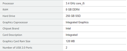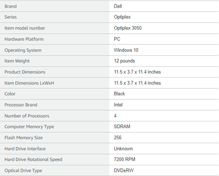 ProcessorIntel Core 7th Generation i5-7500 Processor (Quad Core, up to 3.80 GHz, 6M Cache, 65W)Operating SystemWindows 10 ProMemory8GB DDR4Hard Drive256GB 2.5Inch SATA Class 20 Solid State DriveGraphics CardIntel Integrated GraphicsOptical DriveNoneWirelessNo Wireless CardKeyboard and MouseIncludedPorts & Slots1 x Power button1 x Universal Audio Jack4 x USB 2.0 ports4 x USB 3.1 Gen 1 ports1 x HDMI 1.41 x DisplayPort 1.21 x 1/8" (3.5 mm) Headphone/Microphone1 x 1/8" (3.5 mm) Line-Out1 x Integrated Speaker1 x RJ-45Dimensions & Weight3.7 x 11.4 x 11.5" / 9.4 x 29.0 x 29.2 cm11.31 lb / 5.13 kg (Minimum weight)