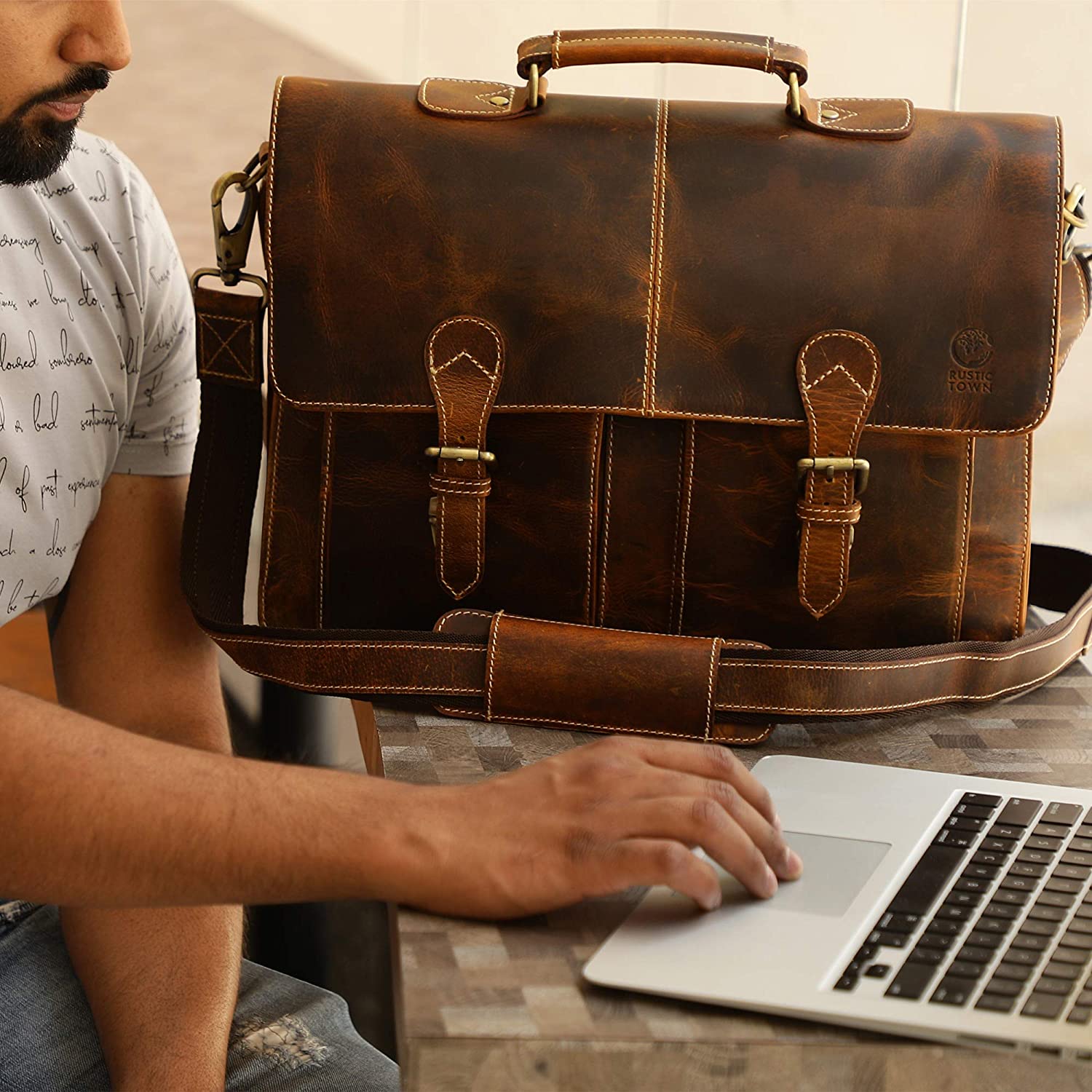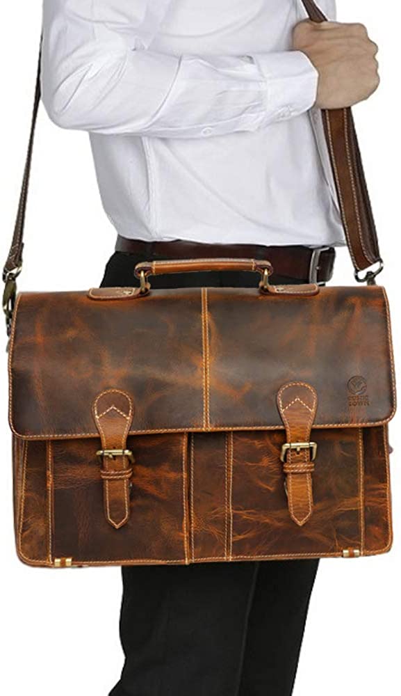 If a stuffy briefcase isn't quite you, and a backpack is too much hassle on a busy commute then Rustic Town messenger bagsare just thing; their fashionable & super-practical. LOOK DIFFERENT WHEN IT COUNTS For office meetings take off the shoulder briefcase strap and use the handle to carry as a business case or leather laptop bag;then on your way home use as a stylish satchel. It goes through a vegetable tanning process to retain the natural characteristicsof leather; which is why each bag has its own charm. Here are some more reasons this is a great choice Hard wearing Looks vintage yet modern Nature-friendly & recyclable Won't tear or puncture easily A great choice for commuters A stunning depth of warm natural tones Top Grain leather not an imitation Rustic Town works with Indian organizations to keep alive traditional artisan skills I CARRY A LOT WILL IT TEAR? No, we have extra-strong stitching sewn by professionals who understand messenger bags! Being 100% genuine buffalo leather,it's strong & durable while looking soft and luxurious. IS IT LINED? Yes, it is lovingly made with dark brown thick canvas lining to protect your items and the bag itself. It's a great size fortaking a small laptop, tablet and college or workbooks with you. Buy with confidence, covered by our 100% Money Back Buffalo Strength Guarantee, no questions asked. Click Add to Cart now to get your uber-hip Boho man bags on the way. A perfect gift bag for Men, Women, teacher & best friend on every Occasion like Birthday gift, Christmas gift, Friendship gifts, Thank you gifts, 3rd Wedding Anniversary gifts, Xmas gift, Valentine's day gifts for him and her or great deal to buy on black Friday deal 2021 and cyber Monday sale.