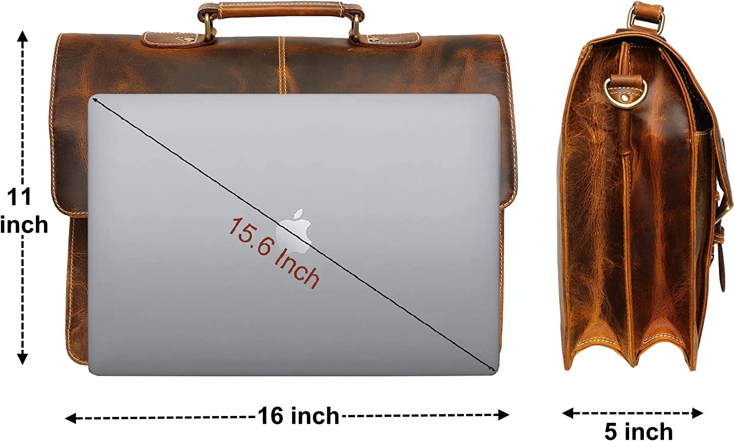 • ✅ DIMENSIONS... 16 x 11 x 5 inch (LxHxW). The Leather Laptop Bag has an ample space to keep your favourite Macbooks, Chromebooks and Laptops upto 15.6 inches in size.