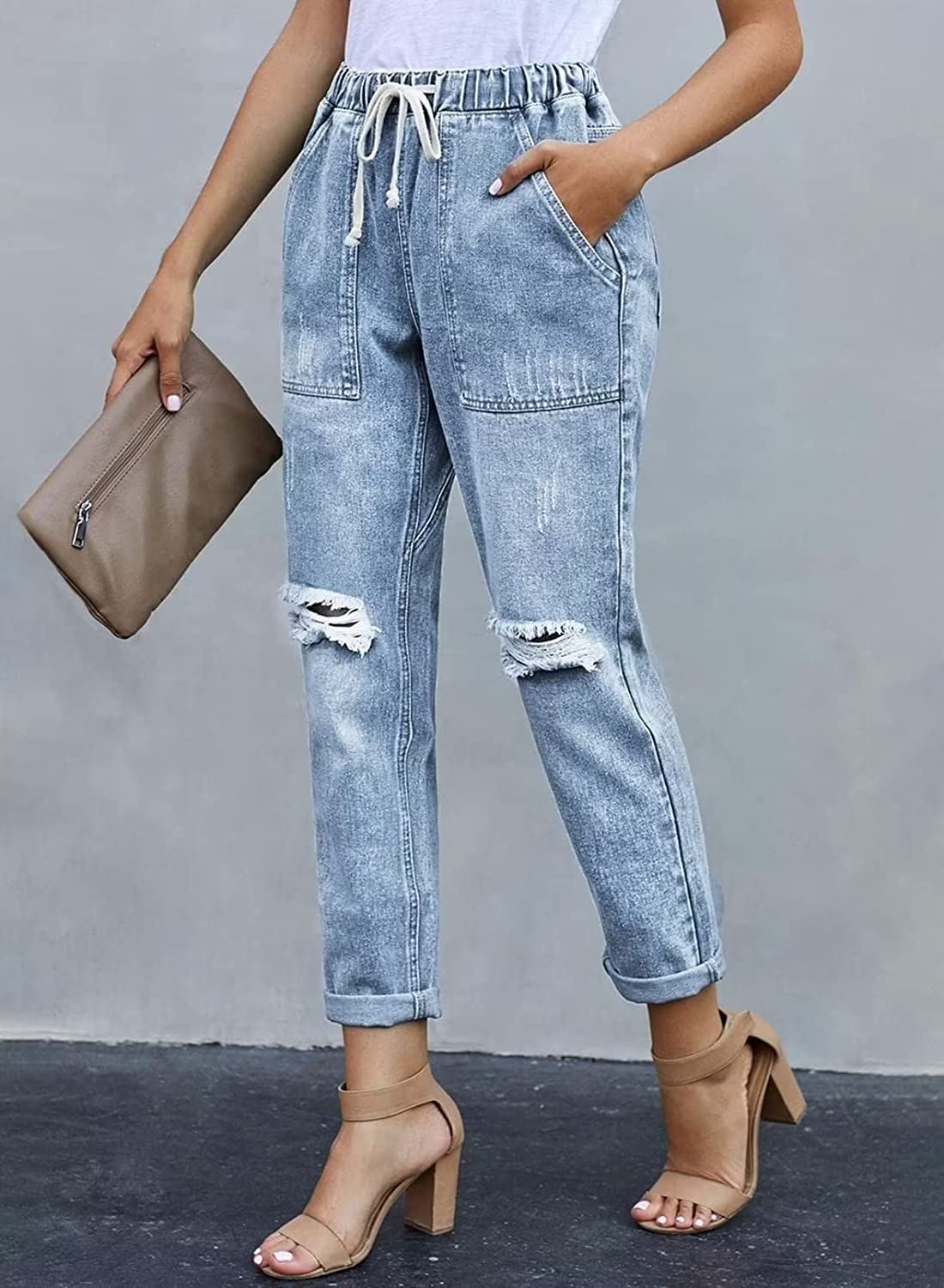 Distressed pocketed denim joggers are a trendy and comfortable alternative to traditional jeans. They feature a tapered leg and a gathered ankle, giving them a relaxed and casual fit.