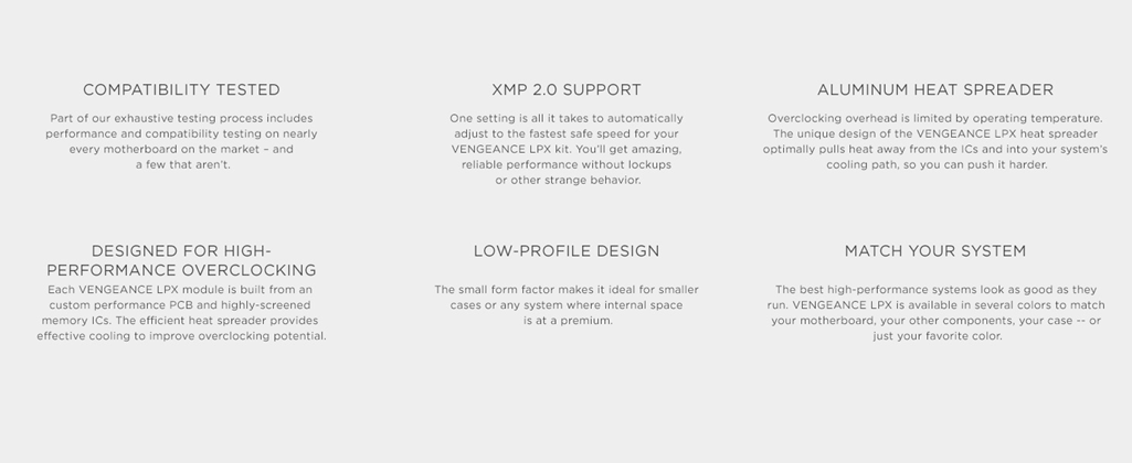 • VENGEANCE LPX is optimized for wide compatibility with the latest Intel and AMD DDR4 motherboards