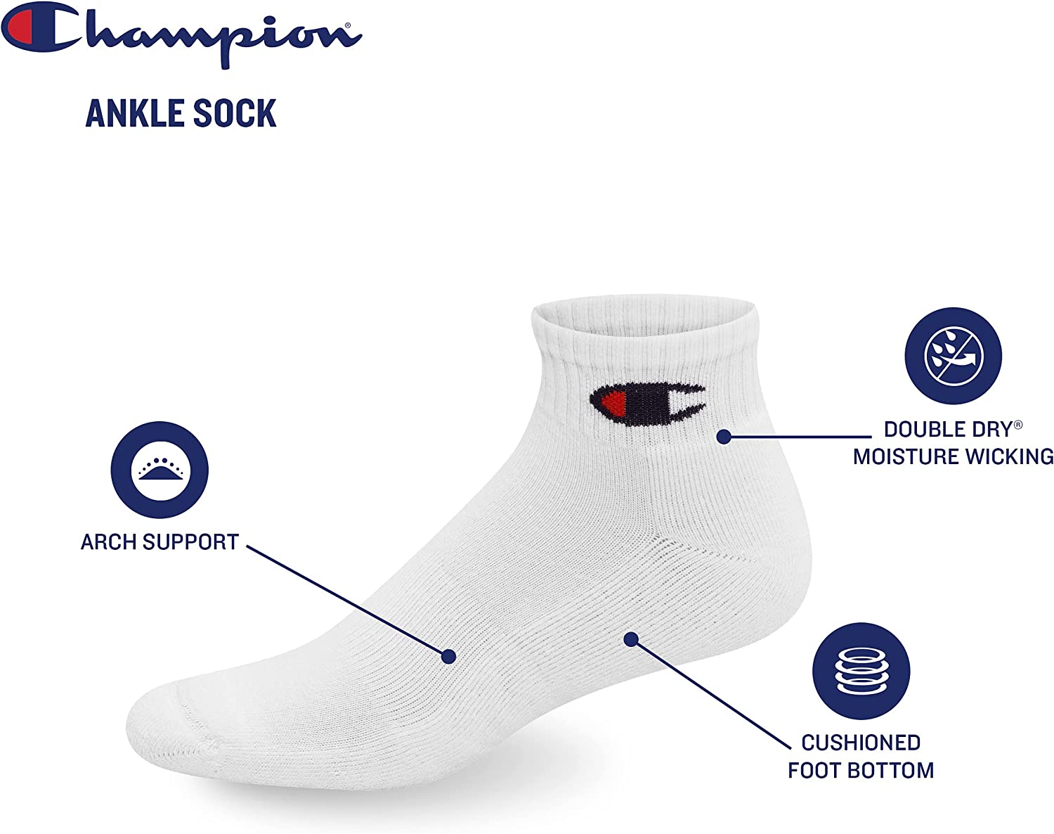 Designed to keep you cool and comfortable, Champion® men’s ankle socks help you power through your routine. Double Dry™ technology wicks moisture so you stay cooler and drier no matter how hard you go. A cushioned footbed acts as a shock absorber so your feet are more protected during a high-impact workout. Arch support ensures a comfortable, secure fit. Crafted from a soft, polyester/spandex blend, these men’s athletic socks hug your foot and hit at the ankle. The cherry on top? All pairs of this socks multipack feature the iconic knit-in C logo for a boost of pure Champion style.