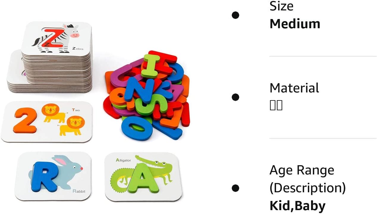 - 【Learning Letters & Numbers】Alphabet Matching Cards Contains 36 flashcards (Alphabet A-Z and Number 1-10) and 37 high quality smooth wooden blocks. Bright color and vivid picture can inspire your children's interest in learning, Kids can learned not only the letters but also some words of animals.